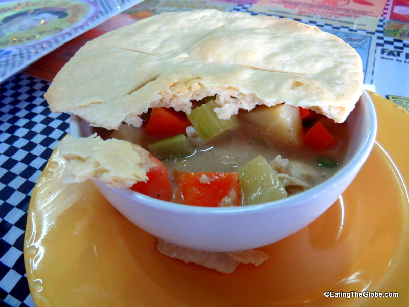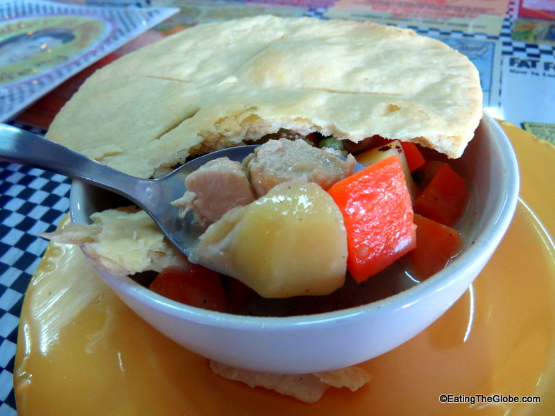 I had a tough time deciding between the many breakfast items and the “home-cooking” type of main courses. I finally chose the chicken pot pie, and I was glad I did. It was almost as good as my Mom’s. Hey, my Mom lives in the deep South, so that’s a huge compliment. The chicken was tender, the vegetables cooked perfect, and, oh that crust, so flaky.