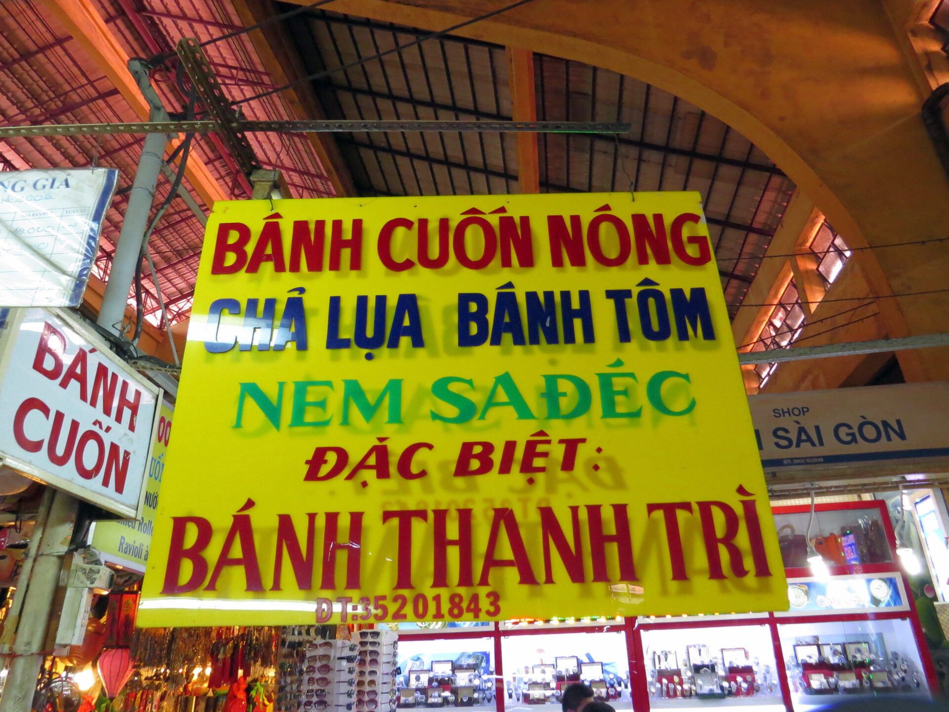 This dish is one of the first things that I devoured in Saigon, and it was one of my favorite things I ate. These rice crepes were so light and delicate, yet very flavorful. They were filled with minced pork, onions and wood ear mushrooms and sprinkled with fried onions. I was also served a plate of herbs, bean sprouts, and cucumbers to put on top. I don’t think that this stall has a name, but look for the yellow sign above the stall in the picture below.