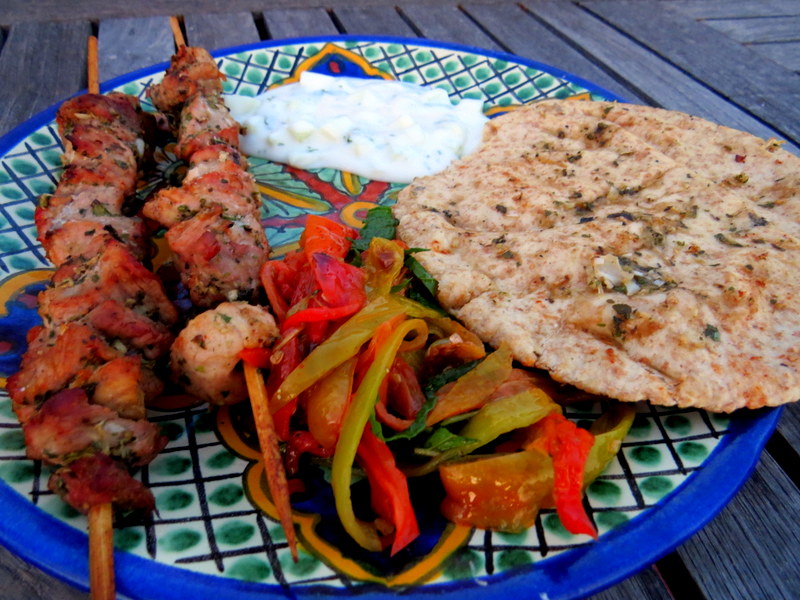 One hour before you plan to grill the souvlaki, soak wooden skewers in water so they won’t burn on the grill. Skewer the meat, and grill over hot coals about 6-7 minutes per side. (I also add soaked cherry wood to my coals for a smoky flavor.) Grilled peppers aren’t a traditional part of souvlaki, but I also like to rub some olive oil on the peppers and grill them until blistered. At the last second, rub olive oil and minced garlic over pita bread, and grill that on both sides. Put the grilled peppers in a paper bag for five minutes, and then remove the skins. Slice and mix with a splash of olive oil, red wine vinegar, chopped mint, salt and pepper. Serve with Tzatziki Sauce.